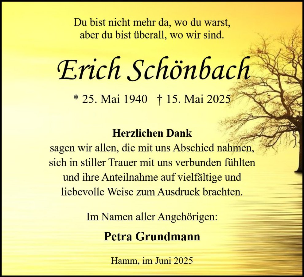 Ich wünsche euch viel Kraft und Stärke für die nächste Zeit Monika Zuletzt gesehen habe ich Erich zur Beerdigung von Jürgen trotz Schnee und sehr schlechtem Wtter ist er gekommen,das Auto fahren machte ihm nichts aus .Ich habe mich sehr gefreut damals ,weil viele andere nicht kamen wegen des Wetters.