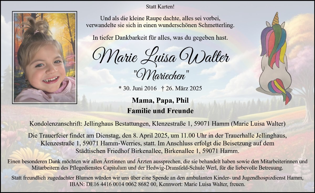Liebe Jennifer, Stefan und Phil"Wir finden keine Worte, die den Verlust eurer kleinen Marie Luisa mildern könnten."Wir wünschen Euch alle Kraft dieser Welt."In tiefem Mitgefühl"Kirsten, Nick und Tim